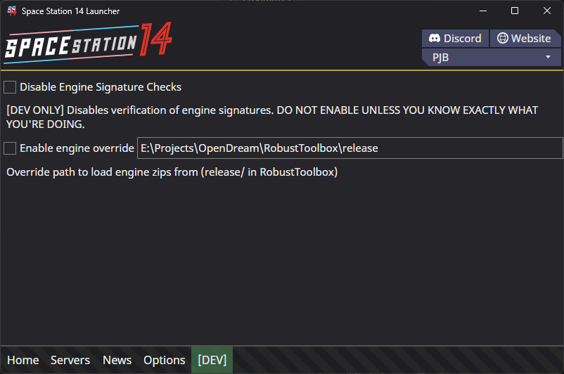 Tick both checkboxes, then set the text box to the release/ directory of the Robust you’re working out of. This will make the launcher use exclusively local engine builds you’ve made, regardless of what server you connect to.