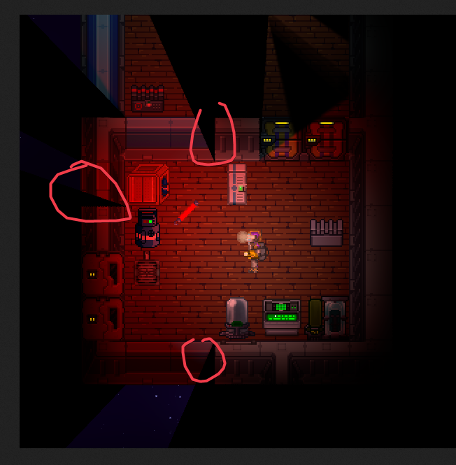 A better looking (but more expensive) approach would be to custom-generate occlusion geometry for every light source. This would require significantly more CPU effort. When doing this on the CPU we know exactly the distance from the light source and can generate decent-looking penumbras and such. (note from 20kdc: if antialiasing wasn’t needed, a GPU vertex shader and use of the stencil buffer could probably get something performant going here, but it’d be much more of a separate technique and not as tunable as what’s in place now.)